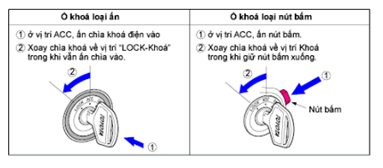 - Khi ta ấn chìa khoá vào trong khi ở vị trí ACC, rô to và tấm đẩy cũng bị đẩy vào. Phần trên của tấm chặn sẽ nhô lên vách chéo của rãnh trong tấm đẩy và phần thấp hơn của tấm đẩy chuyển động vào trong trục cam. Chìa khoá điện, tấm đẩy và trục cam sẽ tự do xoay theo một khối thống nhất từ vị trí ACC tới vị trí LOCK. Tuy nhiên do đầu của cần nhả khoá vẫn bị chìa khoá giữ xuống, cữ chặn khoá và thanh khoá không thể dịch chuyển được sang trái.