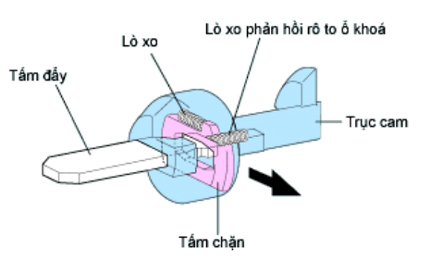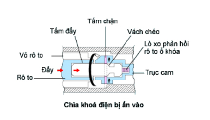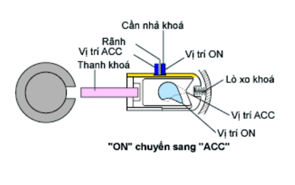 - Chừng nào mà chìa khoá điện không bị ấn vào trong khi khoá đang ở vị trí ACC, tấm đẩy sẽ bị lò xo phản hồi của rô to ổ khoá đẩy ra ngoài. Do đó, tấm chặn nhô ra ngoài và va vào thân khoá ngăn rô to và chìa khoá điện xoay về vị trí khoá.