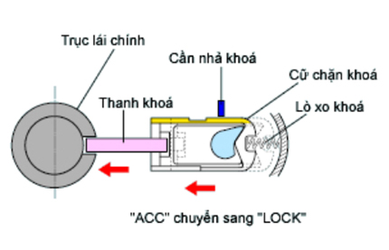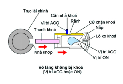 - Khi chìa khoá điện chuyển từ vị trí ON sang ACC (tắt động cơ) thì cần nhả khoá sẽ đập vào mép trái của rãnh trong cữ chặn khoá, ngăn cữ chặn khoá và thanh khoá dịch chuyển sang trái (và do vậy ngăn việc khoá vô lăng).