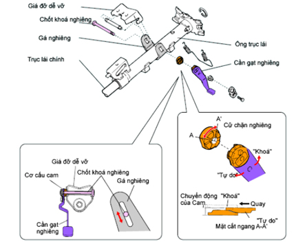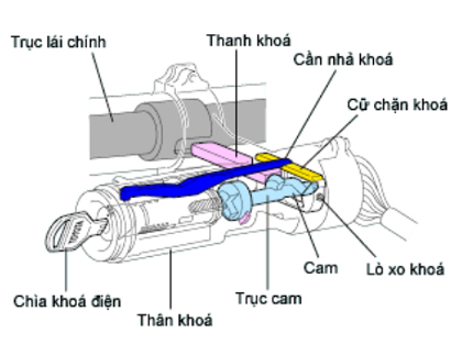 - Khi chìa khoá điện ở vị trí ACC hoặc ON thì cữ chặn khoá và thanh khoá bị cam của trục cam đẩy sang phải. Cần nhả khoá sẽ tụt vào rãnh trong cữ chặn khoá, ngăn cữ chặn khoá và thanh khoá dịch chuyển sang trái, do vậy ngăn việc khoá vô lăng trong khi xe đang chạy.