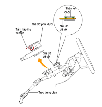 Cơ cấu hấp thụ va đập bao gồm một giá đỡ phía dưới, giá đỡ dễ vỡ, trục trung gian và tấm hấp thụ va đập. Trục lái được thiết kế để hấp thu va đập theo phương hướng trục, lắp với thanh tăng cứng bảng táp lô thông qua giá đỡ phía dưới và giá đỡ dễ vỡ. Trục lái và hộp cơ cấu lái được nối với trục trung gian.