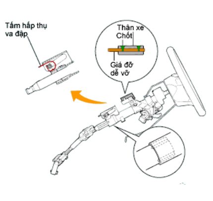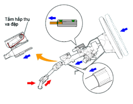 Khi hộp cơ cấu lái chuyển dịch khi xe bị va đập (gọi là va đập sơ cấp) thì trục trung gian co lại, do đó làm giảm khả năng trục lái và vô lăng nhô lên trong buồng lái. Khi một lực va đập được truyền vào vô lăng trong sự cố đâm xe (va đập thứ cấp) thì cơ cấu hấp thụ va đập và túi khí của người lái giúp hấp thu va đập. Hơn nữa, giá đỡ dễ vỡ và giá đỡ phía dưới tách ra làm cho toàn bộ trục lái đổ về phía trước. Lúc này tấm hấp thụ va đập bị biến dạng để giúp hấp thu tác động của va đập thứ cấp.