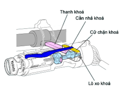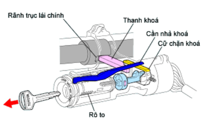 - Khi rút chìa khoá điện ra khỏi rô to, cần nhả khoá tách ra khỏi (dịch chuyển lên) cữ chặn khoá, và thanh khoá sẽ chui vào rãnh trục lái chính và khoá trục lái chính.